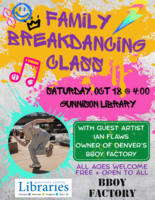 Please join us at 4 pm at the Gunnison Library on Saturday, October 18 for a Family Breakdancing Class. Guest artist Ian Flaws, owner of Denver’s BBoy Factory, will instruct participants of all ages on Breakdancing! Free and open to the public. Click here for the event website |