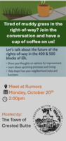 Tired of muddy grass in the Elk Ave. right-of-way? Share your thoughts, learn about the process, and enjoy a cup of coffee on the Town! There will be a community meeting to discuss improvements to the right-of-way in the 400 & 500 blocks of Elk Ave. at Rumors on Monday, October 20th at 2:00pm. |