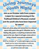 Join us on October 29th from 5:30pm-7:30pm for a special evening at the Trailhead Children's Museum created just for youth who have been impacted by cancer! Enjoy art, pizza, play, and connection in a relaxed space with peers who get it. Whether you're feeling silly, quiet, or anything in between this space is for you. Open to all ages, come solo or bring a friend—everyone is welcome! Click here for the event website |