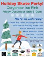 Join us for a night of holiday cheer at Jorgensen Ice Rink for our annual Holiday Skate Party. $5 for entrance fee and skate rental. Enjoy food specials along with free s'mores, free hot chocolate and free raffle ticket. Over $300 in prizes from local businesses. Come in your best Christmas outfit and skate to the music of the holiday season. |