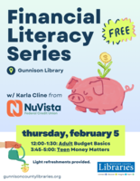 Attention adults and teens! Please join us on Thursday, February 5 at the Gunnison Library for a FREE Financial Literacy course with Karla Cline, Financial Literacy Specialist from Nuvista Credit Union. Light snacks provided. Adult Class: 12 noon Teen Class: 3:45pm – 5pm Click here for the event website |
