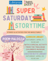 Join us at the Gunnison Library at 10:30 am on Saturday, April 11 for Super Saturday Storytime. April’s theme is Poem Palooza! Stories and activity for the whole family. With a special activity from the Trailhead Children’s Museum. Free & open to the public. Click here for the event website |