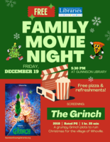 Please join us at 5:30 pm at the Gunnison Library on Friday, December 19 for a FREE screening of The Grinch (PG - 2018). Bring your coziest blanket and pjs and enjoy this fun family film. Free pizza and refreshments provided! Free & open to the public. Click here for the event website |