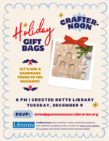 Join us at the Crested Butte Library at 6 pm on Tuesday, December 9 for Crafternoon. For December we’ll be making DIY Holiday Gift Bags. Please RSVP to dylan@gunnisoncountylibraries.org. Crafternoons are monthly maker-oriented sessions with different projects every month for teens and adults. All supplies and basic instructions are provided. Free & open to the public Click here for the event website |
