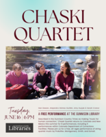 Please join us at the Gunnison Library on Tuesday, June 16 at 6 pm for a special, free performance by Chaski Quartet. Described in the Gunnison Country Times as making “music for human connection,” Chaski Quartet returns to Colorado and New Mexico this summer for 8 performances, including 5 performances within Colorado Department of Corrections Facilities. Please join us for a free, all-ages performance of string quartet music by Prokofiev, Montgomery, Smith, and Esmail. The name Chaski Quartet was inspired by the 4th movement, which describes the running messengers of the Andes mountains, who would travel long distances to relay important messages and stories between communities. As musicians who commute a long way to bring music to various communities around the US, and as runners, the image of the chaski stuck! Click here for the event website |