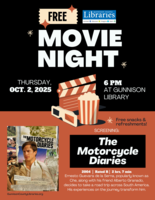 Please join us at 6 pm at the Gunnison Library on Thursday, October 2 for a FREE screening of The Motorcycle Diaries (R). Snacks provided! Free & open to the public. 2004 | Rated R | 2 hrs, 7 min Ernesto Guevara de la Serna, popularly known as Che, along with his friend Alberto Granado, decides to take a road trip across South America. His experiences on the journey transform him. Click here for the event website |