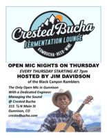Jim Davidson hosts Open Mic Night at Crested Bucha in Gunnison, CO. There is never a cover charge and it is the only open mic in Gunnison with a managed professional sound system. Click here for the event website |