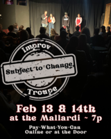 Subject to change is back in our first show of the year on the Mallardi Cabaret Stage. As always we have members of the rotating comedy troupe coming together to create hilarity on the spot. We can all use a lil’ levity this Valentines Day weekend, plus the pay-what-you-can ticket price and drink specials make it the cheapest date in town. Enjoy comedy improv Friday and Saturday at 7pm. Click here for the event website |