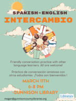 Join us on Wednesday, March 11 at the Gunnison Library for Intercambio! Come practice your English or Spanish with members of your community. Community Building • Free & Everyone welcome! ¡Únete a nosotros el miércoles 11 de marzo en la Biblioteca de Gunnison para Intercambio! Practica tu inglés o español con miembros de tu comunidad. Construyendo Comunidad • ¡Gratis y bienvenidos todos! Click here for the event website |