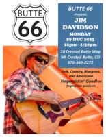 Details: Jim Davidson performs at Butte 66 in Mt Crested Butte, CO from 12pm to 1:30pm, either on the deck or inside depending on weather.