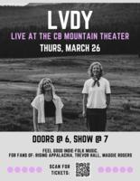 Join us for an intimate concert at the CB Mountain Theater on Thursday, March 26! 403 2nd St, Crested Butte, CO 81224 6:00 pm doors, music will start promptly at 7:00 pm. Please don't be late. This is an all ages show. ABOUT THE BAND: LVDY [pronounced LADY] is the Colorado-based duo of Kathleen Hooper and Aubrey Mable, creating music that moves, uplifts, and connects. With roots in singer-songwriter, indie-folk and a sound shaped by soaring harmonies and organic instrumentation, LVDY crafts songs that feel like home. In unison it is almost unrecognizable who’s who, and in harmony, an effortless blend that welcomes the exhale. Their uplifting sound and intimate storytelling weave love anthems in and out of their messages, with simple yet important reminders that we’re not alone. Their ethereal harmonies, musical warmth, and meaningful lyrics find inspiration in the beauty of the outdoors as they draw influence from artists like Maggie Rogers, Rising Appalachia, Brandi Carlile, JOSEPH and Trevor Hall. Formed in 2018, LVDY has played hundreds of shows across the U.S. & Europe—self-funded, self-built, and community-powered. With their start as buskers on sidewalks, they’ve grown a loyal grassroots fan base affectionately known as the LVDYMOB and have shared stages with Rising Appalachia, KT Tunstall, JOSEPH, Emily Scott Robinson, Brendan James, and Joy Oladokun, creating live experiences that feel like you’re getting to know friends. Their debut album, Gold, came to life in 2020 through a successful Kickstarter campaign, followed by The Woods in 2022. In February 2024, they released Feathers, a dynamic EP produced by award-winning artist Dan Rodriguez, marking a new chapter in their evolution. 2025 led them to produce another EP, evergreen, as well as collaborations with Dirtwire, Random Rab, Sol Rising, and Noah Proudfoot. Click here for the event website |