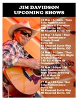 Jim Davidson performs solo at Butte 66 Bar & Grille in Mt Crested Butte, CO from 12pm to 3pm. Click here for the event website |