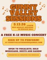 Calling all Gunnison Valley K-12 musicians! Sign up to perform at the upcoming Gunny Valley Sessions event. Open to vocalists, solo musicians, duets and bands! The event is free with a suggested donation of $10 per performer. Each performer will play one song (they can have one extra ready in case theirs time). We invite the community to join us for a lively evening on Western's campus where all genres and skill levels are welcome! This event will take place inside to Quigley's Kincaid Hall. |